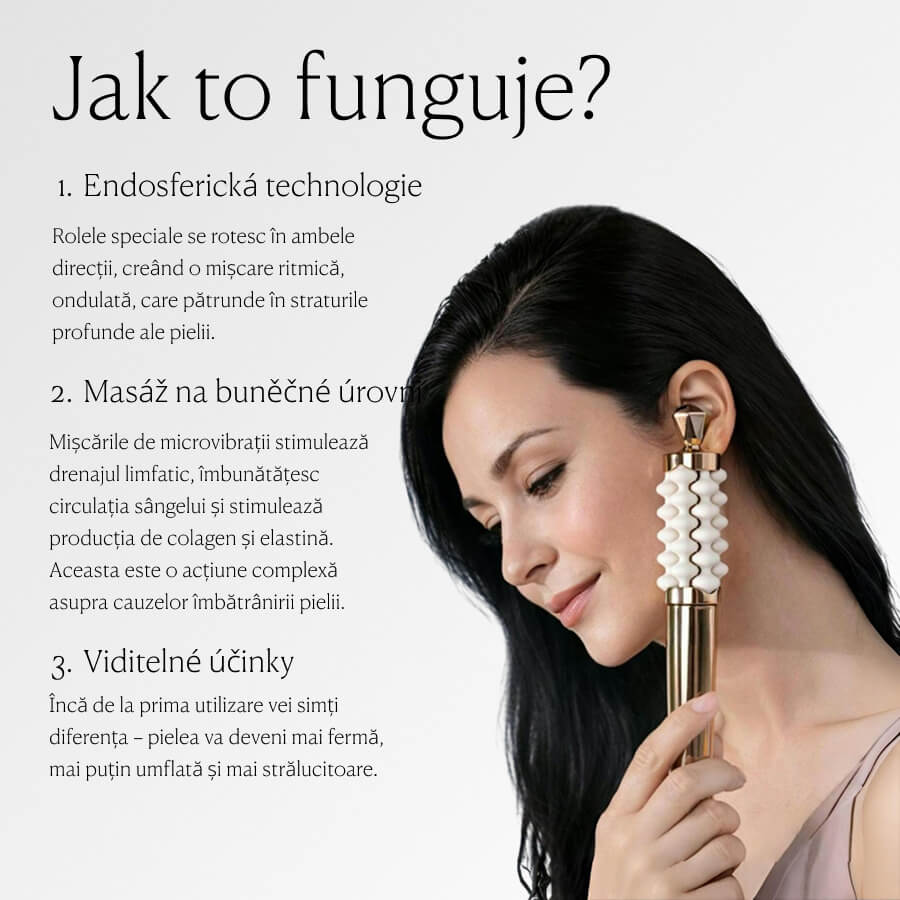 Pocítěte, jak rotující sféra jemně uchopuje a masíruje vaši pleť, odvádí lymfu, odstraňuje otoky a aktivuje přirozenou regeneraci pokožky pomocí endosférické technologie! Nahraďte drahé krémy a procedury a umocněte účinky masáže kobido pětiminutovou masáží, kterou provedete bez vycházení z domu!